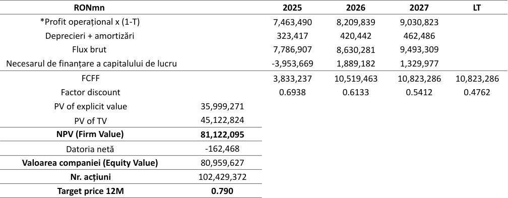 FCFF - Prognozele au fost realizate pe termen mediu, perioada 2025-2027 fiind considerată un termen mediu de investiție. Pentru determinarea prețului-țintă s-au considerat, drept punct de pornire, rezultatele financiare aferente anului 2024.