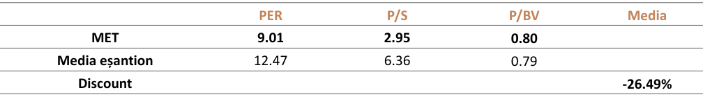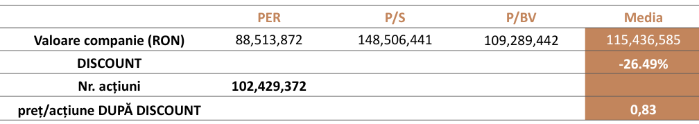 În vederea integrării în model a specificului activității, respectiv a gradului de dezvoltare a competitorilor săi, au fost acordate următoarele discounturi multiplilor de piață, calculate ca și diferență între valoarea înregistrată de către Emitent la momentul redactării raportului, respectiv media indicatorilor companiilor din eșantion.