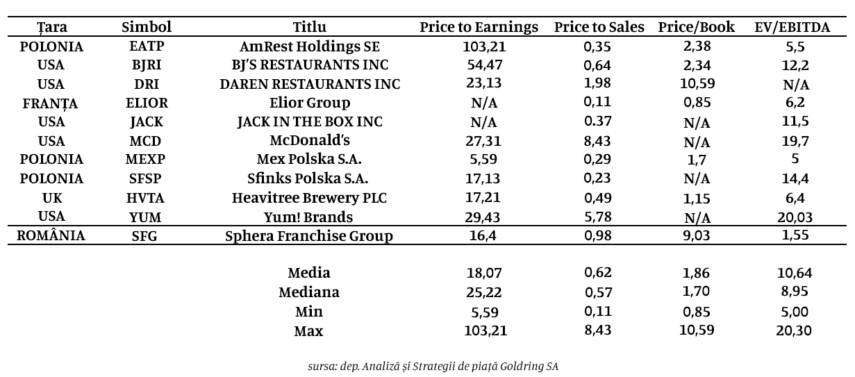 Metoda comparației constă în evaluarea companiei în raport cu alte entități listate, considerate relevante din punct de vedere operațional și financiar pentru industria restaurantelor și a serviciilor alimentare. Întrucât piața de capital din România nu include companii listate cu un profil similar celui al Sphera Franchise Group, analiza comparativă a fost realizată utilizând un eșantion de 10 companii internaționale reprezentative.