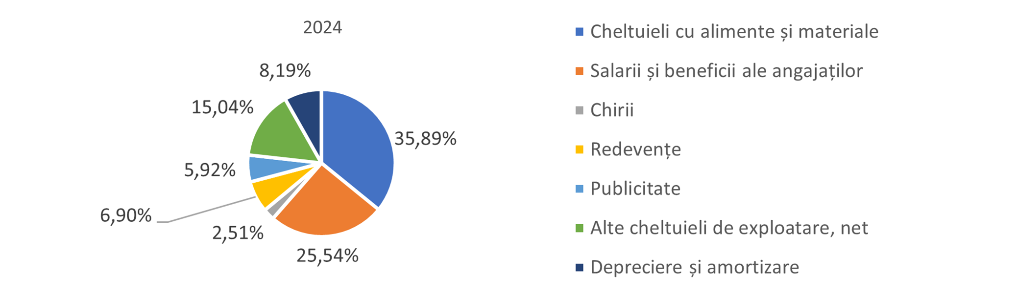 În 2024, ponderea cheltuielilor asociate restaurantelor în totalul vânzărilor a continuat să se reducă, ajungând la 87,6%, în scădere de la 89,1% în 2023. Această îmbunătățire reflectă o eficiență operațională crescută, susținută de o creștere anuală a veniturilor din restaurante de 5,4%, care a depășit ritmul de creștere al cheltuielilor aferente restaurantelor, de doar 3,5%.