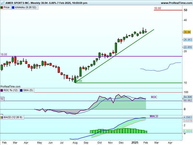 În general, pe graficul săptămânal, acțiunea Amer Sports are un trend ascendent de la minimele din luna aug. 2024. Investitorii ar putea privi orice corecție a prețurilor acțiunii ca pe o oportunitate de a intra din nou la cumpărare.
