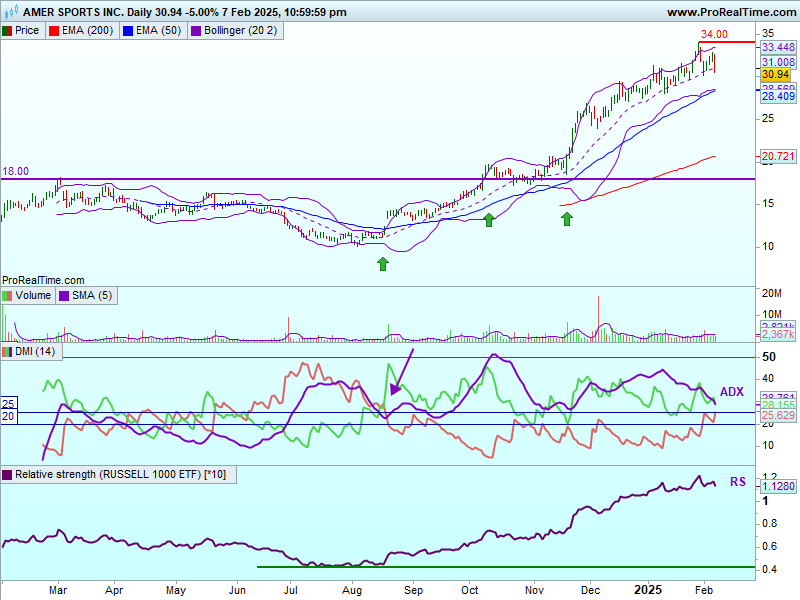 Graficul zilnic al Amer Sports arată că prețurile se află într-un trend ascendent din luna aug. 2024 și au trecut peste un nivel de rezistență constituit din maximele anterioare (de culoare violet) la începutul lunii oct. 2024, de la circa 18$. Odată cu raliul, prețurile au format o bulă ascendentă de la începutul lunii noi. 2024, bulă continuată şi în anul 2025. Ele au avut mici corecții, dar curba mediană a BB a servit drept suport. Prețurile se tranzacționează deasupra mediilor mobile pe 50 și 200 zile, ceea ce este ”bullish”.