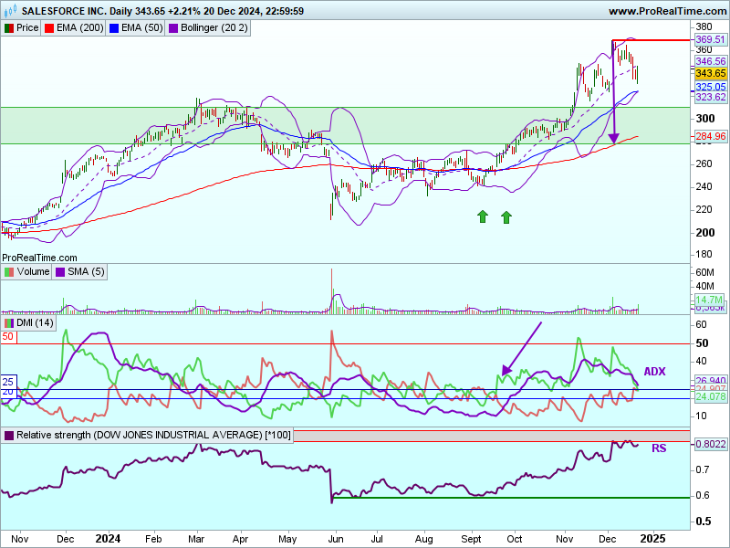 Graficul zilnic al Salesforce arată că prețurile s-au aflat într-un trend ascendent din septembrie 2024 și au depășit o zonă de rezistență formată din maximele anterioare (zona de culoare verde), atingând noi maxime istorice la începutul lunii decembrie 2024, la circa 370 USD. Odată cu ultimul raliu, prețurile au format o bulă ascendentă, care s-a estompat în urma corecției din luna decembrie a.c. Prețurile se corectează acum spre fosta zonă de rezistență, care ar trebui să devină o zonă de suport. În prezent, prețurile se îndreaptă spre curba inferioară a benzilor Bollinger (BB). Este de remarcat faptul că media mobilă pe 50 de zile a depășit-o pe cea pe 200 de zile spre sfârșitul lunii septembrie 2024. Acțiunile se tranzacționează deasupra mediilor mobile pe 50 și 200 de zile, ceea ce este un semnal „bullish”.