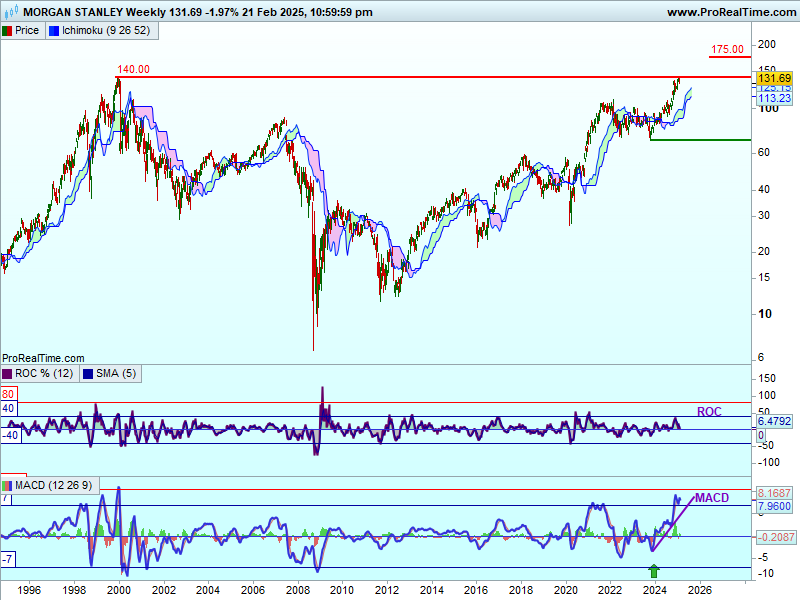 De la minimele de la sfârșitul lunii octombrie 2023, prețurile acțiunii Morgan Stanley au crescut de la un nivel de suport situat sub norul Ichimoku, nivel situat la circa 70$. Ele au ieșit deasupra norului în luna martie 2024. Prețurile se află de atunci într-un trend ascendent deasupra norului. Ele testează un nivel de rezistență istoric, cel de la începutul lui ianuarie 2000, de la circa 140$. Semnalul este convingător, pe măsură ce norul deplasat înainte s-a schimbat și este colorat în verde.