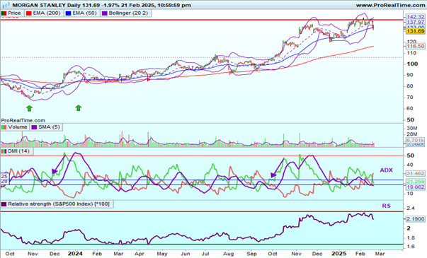 Graficul zilnic al Morgan Stanley arată că prețurile s-au aflat într-un trend ascendent de la sfârșitul lui octombrie 2023 și au testat în ianuarie-februarie 2025 un nivel de rezistență constituit din maximele anterioare din ianuarie 2000 (linia de culoare roșie), de la circa 140$. Apoi, prețurile se corectează de la rezistență. În mijlocul lunii ianuarie 2025, prețurile au deschis o nouă bulă ascendentă, dar care s-a închis între timp. Să remarcăm faptul că media mobilă pe 50 zile a trecut peste cea pe 200 zile la începutul lui ianuarie 2024. Prețurile se tranzacționează deasupra mediilor mobile pe 50 și 200 zile, ceea ce este ”bullish”.