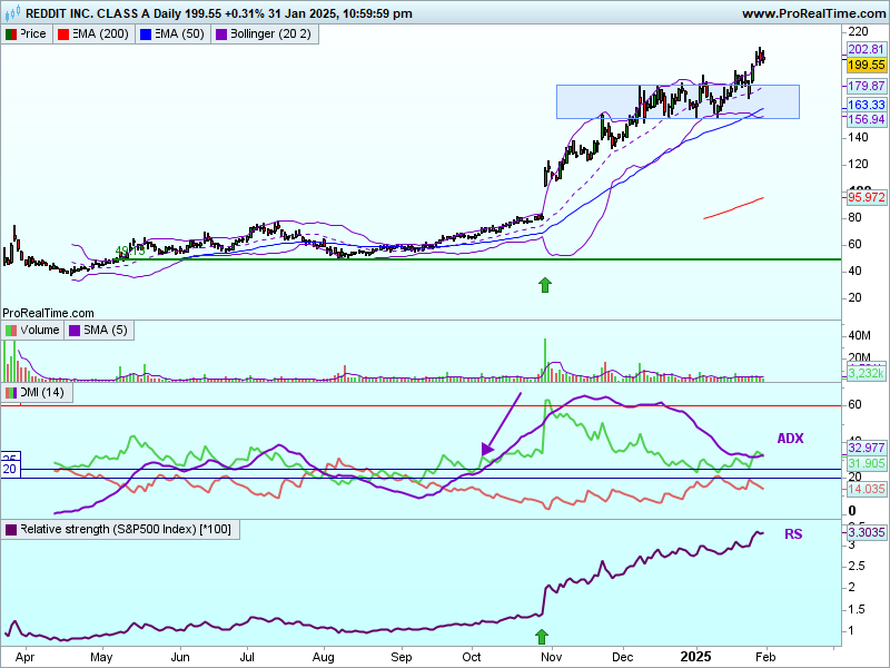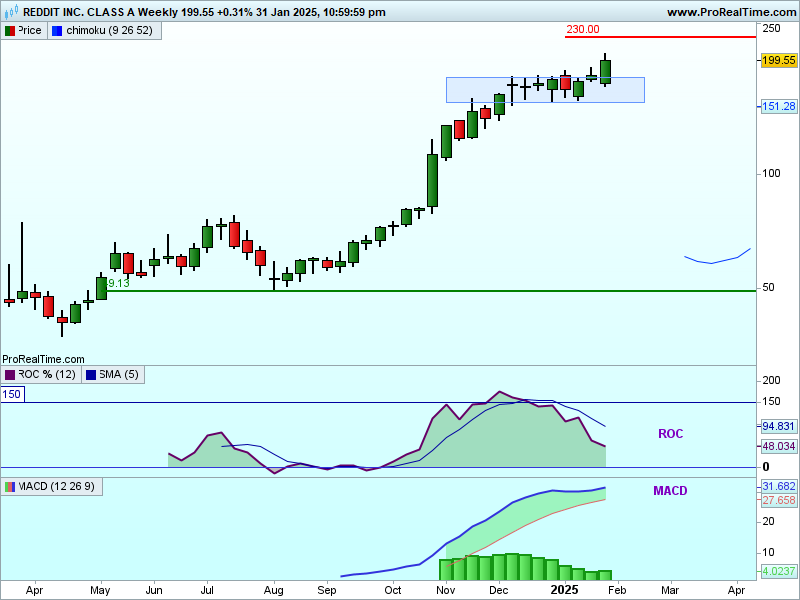Graficul zilnic al Reddit arată că prețurile se află într-o mișcare ascendentă de la sfârșitul lunii octombrie 2024, odată cu publicarea rezultatelor financiare pentru trimestrul III din 2024 și s-au îndreptat să testeze nivelul de la circa 200$. Odată cu raliul, prețurile au format o bulă ascendentă a BB, care s-a continuat după aceea în luna decembrie 2024. Ele au ieșit din dreptunghiul orizontal pentru a atinge noi maxime istorice. Prețurile se tranzacționează deasupra mediilor mobile pe 50 și 200 zile, ceea ce este „bullish”.