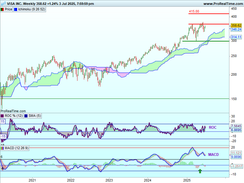 De la minimul din luna apr. 2025, prețurile acțiunii Visa au crescut de la un nivel de suport situat deasupra norului Ichimoku, nivel aflat la circa 300 $. Ele se mișcă deasupra norului. Semnalul este convingător, deoarece norul deplasat înainte este colorat în verde.