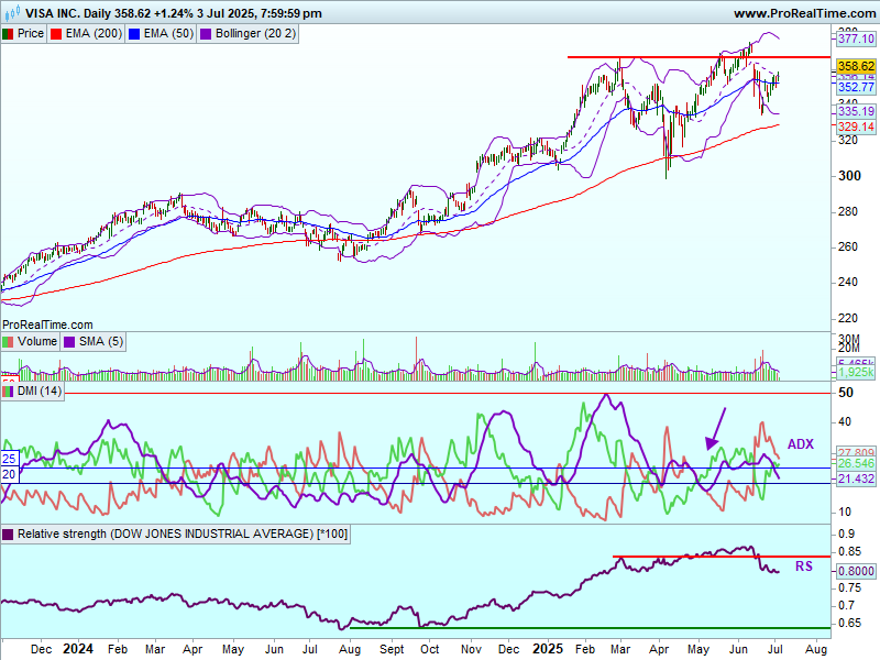 Graficul zilnic al Visa arată că prețurile s-au aflat într-un raliu de la minimul din luna apr. 2025 și au testat un nivel de rezistență cheie constituit din maximele anterioare (de culoare roșie), de la circa 365 $. Prețurile au spart inițial nivelul de rezistență, dar au revenit sub el spre mijlocul lunii iun. 2025 (spargere falsă). Odată cu ultimul raliu, prețurile au format, la începutul lunii mai 2025, o bulă ascendentă a BB. Bula s-a închis spre mijlocul lunii iun. 2025, întrucât prețurile au coborât sub banda mediană a BB. De la minimele din a doua parte a lunii iun. 2025, prețurile au revenit peste banda mediană a BB. Să remarcăm faptul că media mobilă pe 50 de zile a trecut peste cea pe 200 de zile încă din luna dec. 2022. Prețurile se tranzacționează deasupra mediilor mobile pe 50 și 200 de zile, ceea ce este „bullish”.